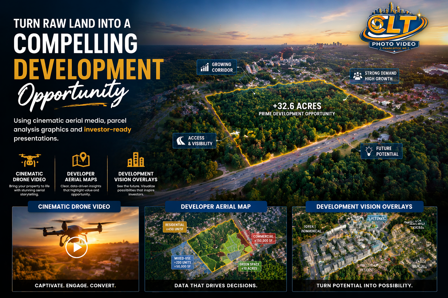 Turn raw land into a compelling development opportunity using cinematic aerial media, parcel analysis graphics and investor-ready presentations.