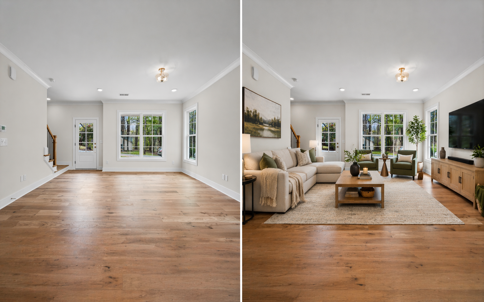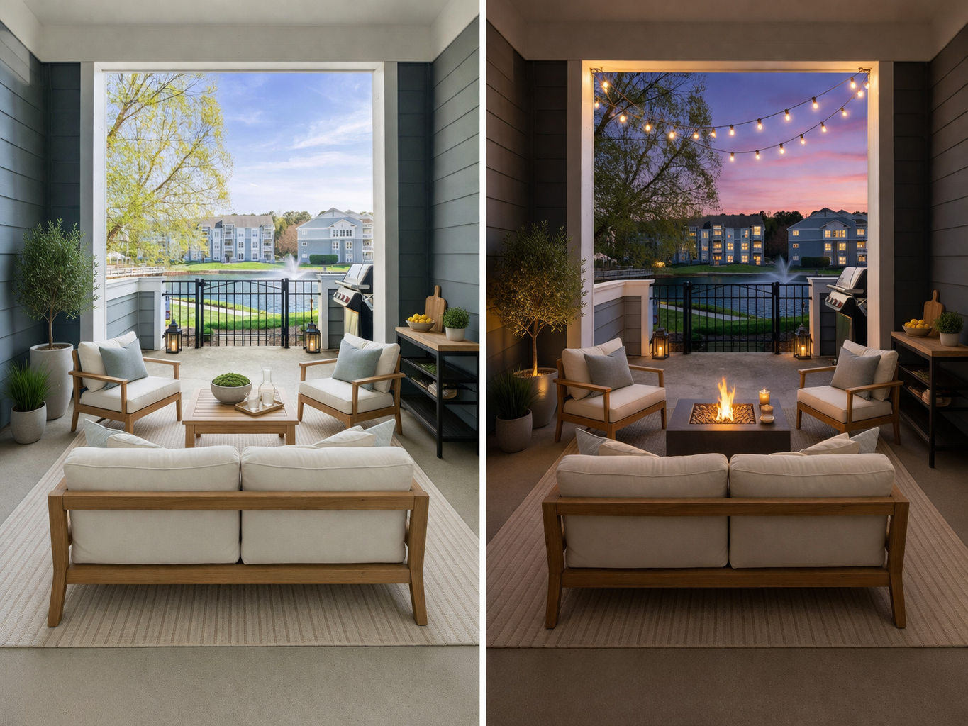 Virtual twilight conversions transform daytime photos into evening-style images with warm lighting and dramatic skies.